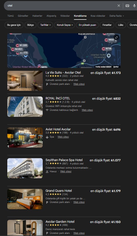 Google Haritalar: Google Haritalar üzerinde otel araması yaptığınızda harita görünümündeki otel pin'lerinin yanında veya listede ziyaretçiye fiyat ve müsaitlik bilgisi gösterilir. Kullanıcı pin üzerine tıkladığında açılan karttan rezervasyon sayfasına doğrudan yönlendirilir, böylece konuma dayalı karar verme süreci hızlanır.