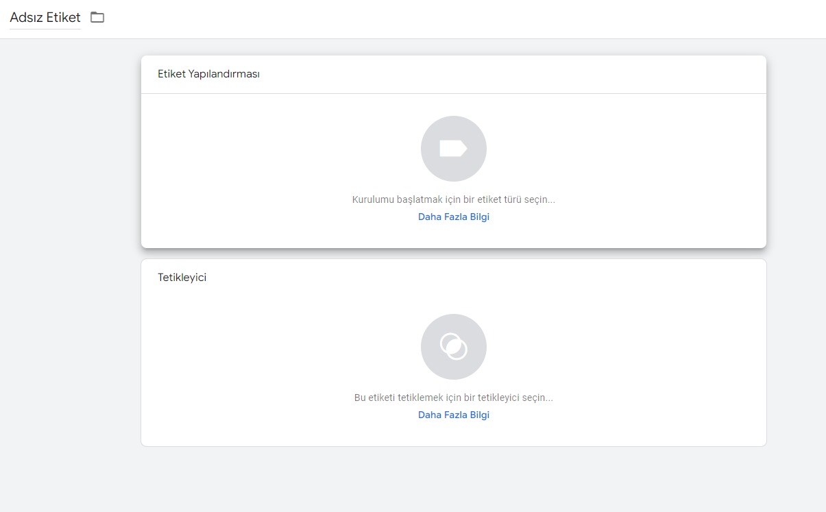 Etiket(Tag): Etiketler sayesinde belli bir kısımda yer alan çeşitli bilgileri alarak sitenizin HTML ya da JavaScript kısmına dair bir kod parçacığı oluşturma imkanına sahip olabilirsiniz. Oluşturulan bu etiket ile GTM'e ne yapılması gerektiğine dair bilgi gönderimi gerçekleştirir. Örnek vermek gerekirse; sitede yer alan ürün sayfasındaki formu kaç kişinin doldurduğu bilgisine etiket oluşturma işleminden sonra erişim sağlayabilirsiniz. Oluşturulan bu etiketin izleme türünün doğru şekilde seçilmesi çok önemlidir,